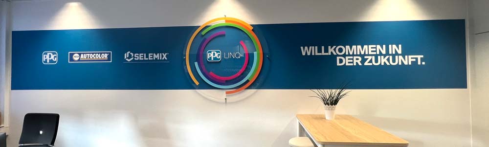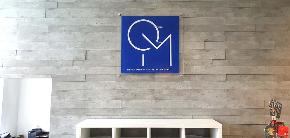 Acrylglasschild ca. 3000 x 2000mm, 10mm stark, mit rückseitigem, hochwertigem Digitaldruck und Edelstahlhalterungen.