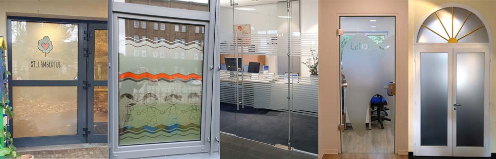 Hier zeigen wir Ihnen fertige Motive aus Glasdekorfolie, die Sie sich beliebig nach Ihren Wünschen und Vorstellungen zusammen stellen können. Darüber hinaus können Sie unseren Sichtschutz-Flyer anfordern.
