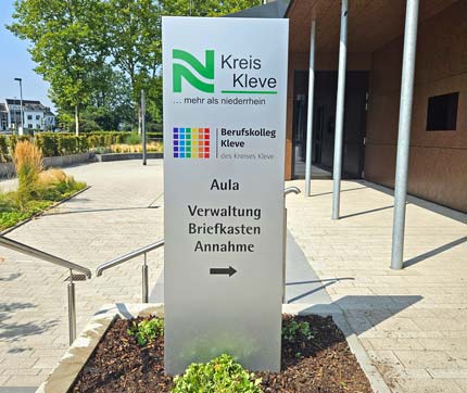 Pylon / Stele aus einer umlaufenden Edelstahlkonstruktion, 50mm dick, beidseitig mit Dibondschilder. Beschriftet mit einem Gebäudeplan als Info.