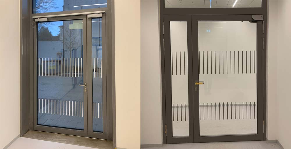 2-farbiger Folienplott, hell/dunkel, 2 Streifen auf Glastüren übereinander.