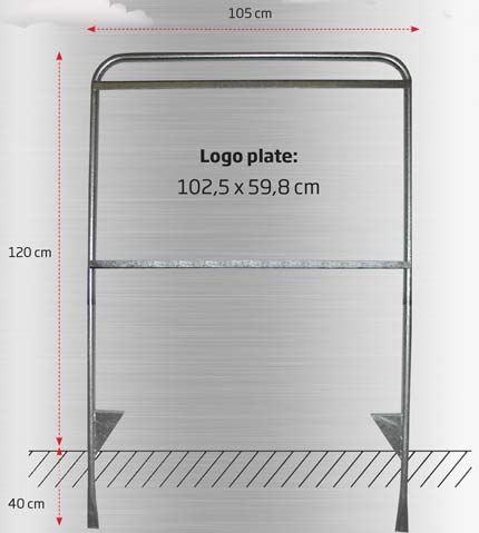 Starker Halter aus 32mm galvanisierten Stahlrohren. Mit Schienen zum Einsetzen von 3mm starken Tafeln. Leicht in die Erde zu stecken (40cm).