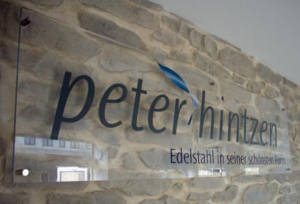 Aus 8-10mm starkem, klarem Acrylglas, mit polierten Kanten und rückseitiger Beschriftung. Im umlaufenden klaren Rand befinden sich die Abstandhalter, 20mm Kopfdurchmesser. Die Firmenlogos, rückseitig, können leicht ausgetauscht werden.