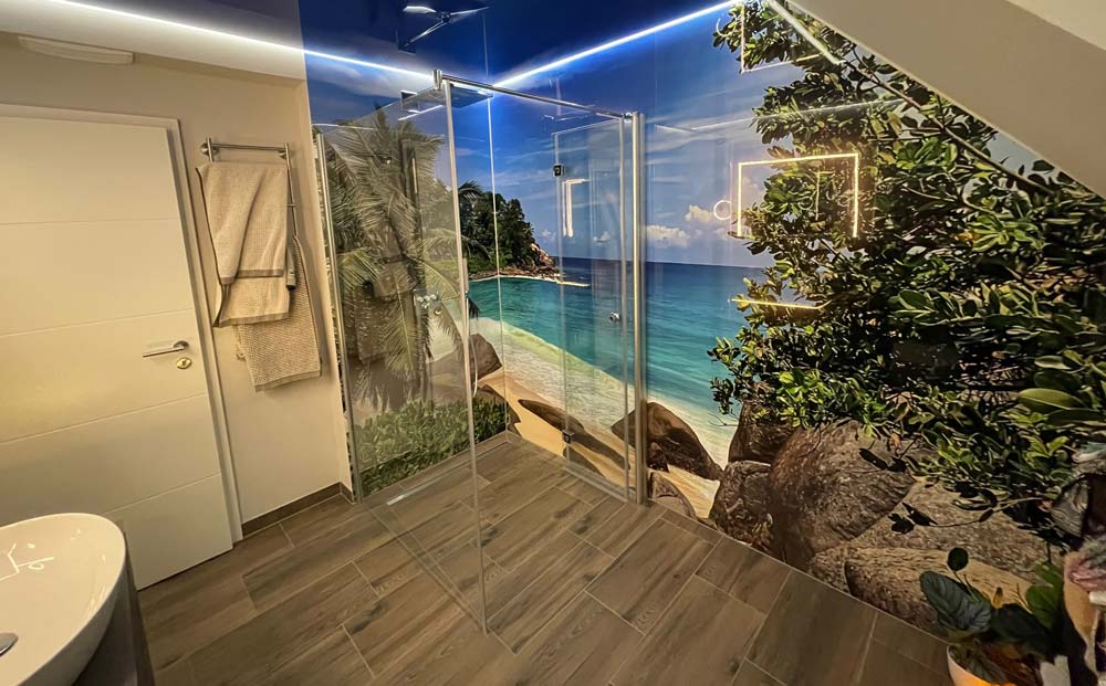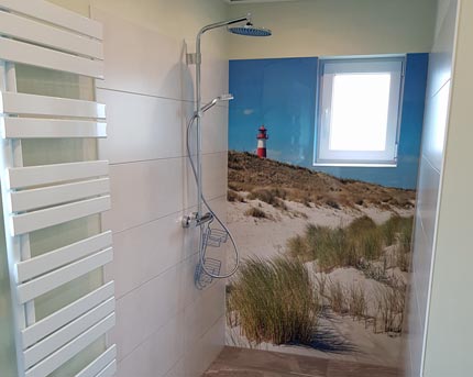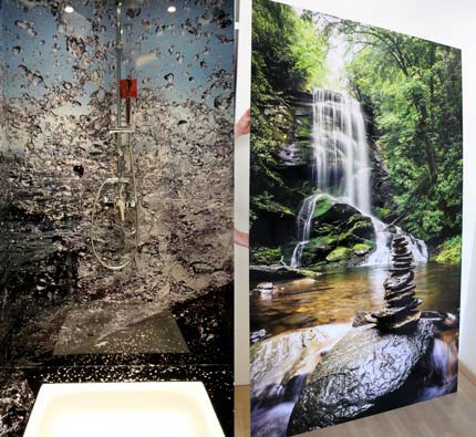 3-seitige Duschkabine mit unseren Tafeln verkleidet und eine Duschrückwand vor der Montage