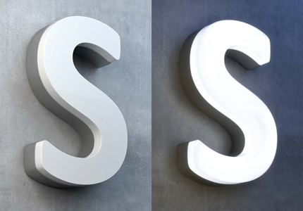 Zweiteiliger Vollreliefbuchstabe, Oberteil aus Acrylglas, in Alu-Unterteil gesteckt (Profil 9a) oder über Alu-Unterteil gestülpt (Profil 9b). Beiden Varianten ist gemeinsam, dass ihre Oberteile aus Acrylglas gefertigt sind, bei denen die Fronten auf schmalere, lichtdurchlässige Zargen geklebt werden. Die Ausleuchteung kann mit Non-Rohr oder mit LED´s erfolgen.