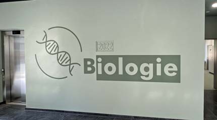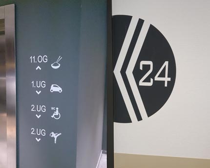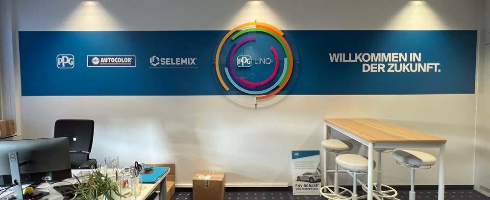 Kombination von Anstrich, Folienplotts und einem Acrylglasschildes.