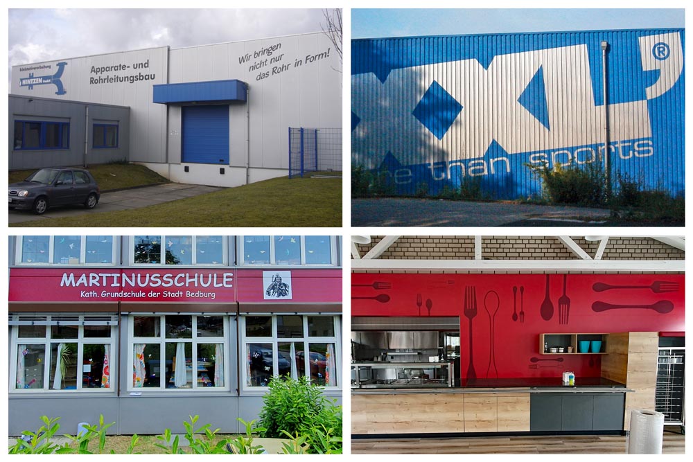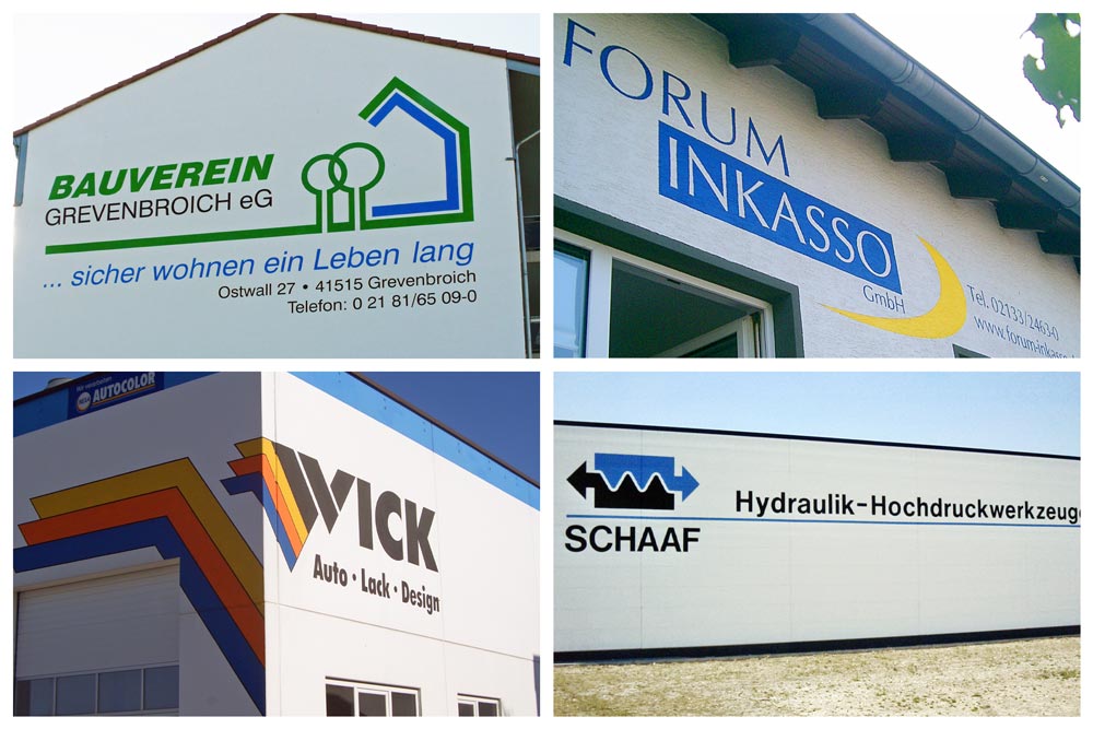mit Pinsel, Farbe, Malstock oder mit speziellen Negativschablonen und Fassadenfarbe. Für eine Aussenwerbung mit großflächigen Logos, Motiven Texten und Flächen.
