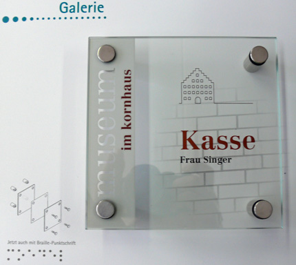 Schilder in Sandwichbauweise mit Glas und Edelstahl.