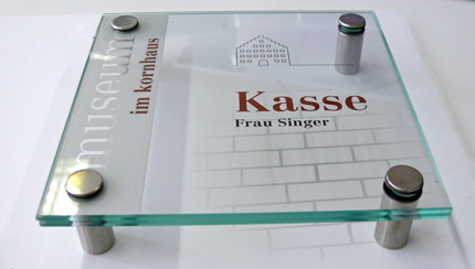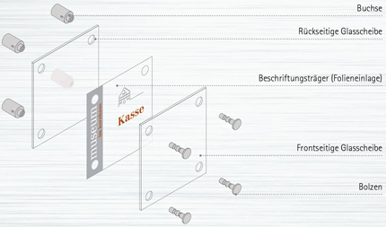 Schilder in Sandwichbauweise mit ESG-Glas und Edelstahl.