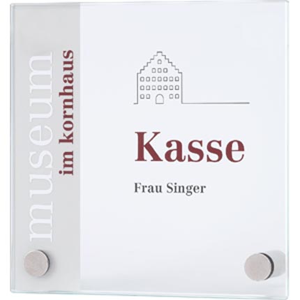 Das edle Glas-Türschild, 150x150mm besteht aus: