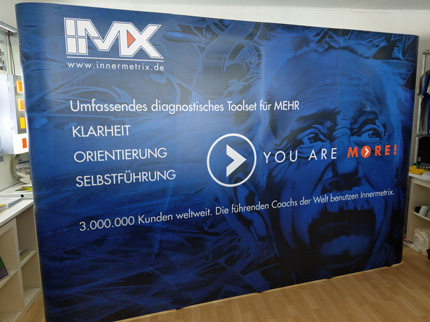 Stabiles Scherengittersystem mit rundumlaufendem Klettband, inklusive stabilem Transporttrolley. Hier 12 Felder, 2,97m x 2,24m mit hochwertiger Stoffbespannung, B1 zertifiziert. Schnell aufgebaut. Der Textil-Digitaldruck kann auch einfach ausgetauscht werden.