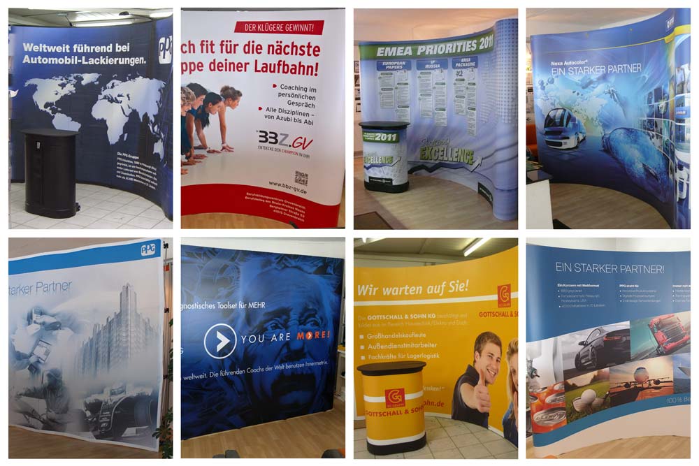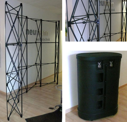 In verschiedenen Ausführungen erhältlich, jedoch immer schnell aufgebaut. Ob aus Pop-Up-Film oder Textil, gewölbt oder gerade. Für den einfachen Transport, alles in einem Transport-Trolly.
