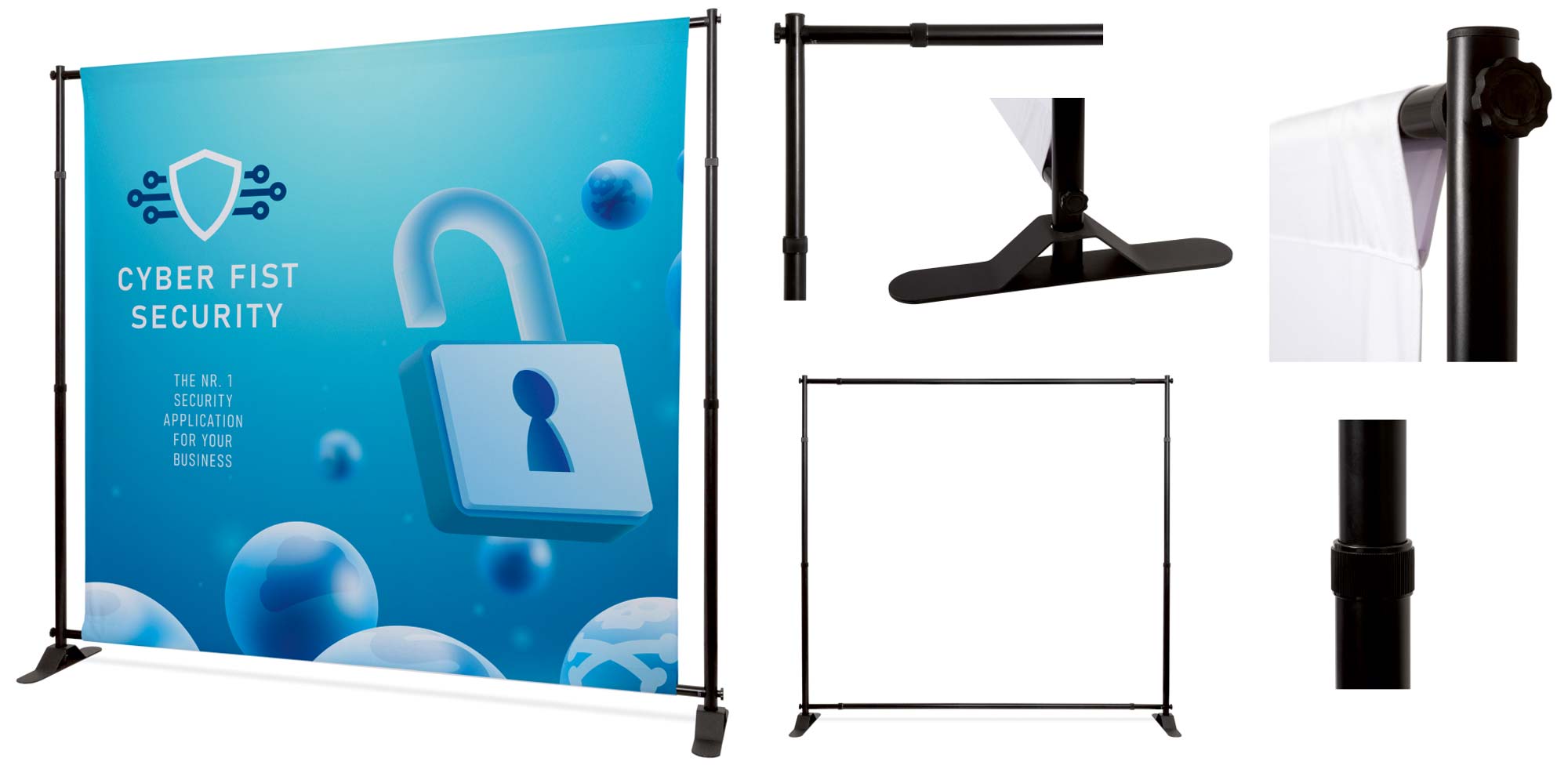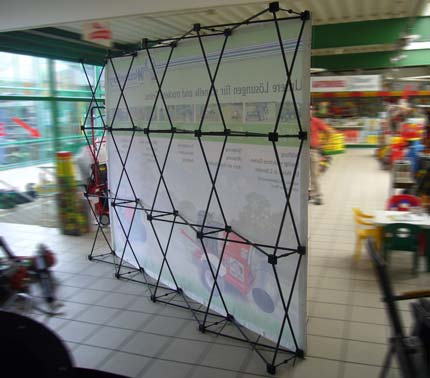 Günstige Messewand. Verstellbar in Höhe und Breite mit Teleskopstangen System mit geringem Gewicht, einfach zu transportieren und bewegen. Eine großartige Werbewand für jedes Budget.