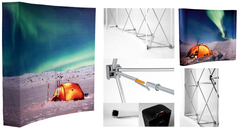 Glatte gebogene Pop-Up-Wand mit gerillten Stangen von 14 mm. Das Pop-Up Impress Curved ist ein hochwertiges Silikon-Kanten Grafik Pop-Up System.