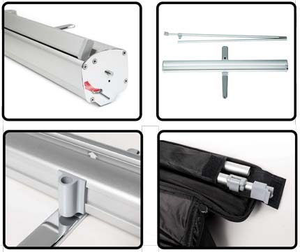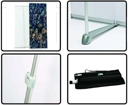 Einseitiger Roll-Up mit 2 Füßen aus silber-eloxiertem Aluminium für den kurzfristigen Einsatz. Klemmleiste oben, inkl. einer schwarzen Tasche.