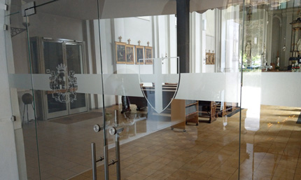 Durchlaufschutz einer Kirchentüre, rückseitig aus Glasdekorfolien.