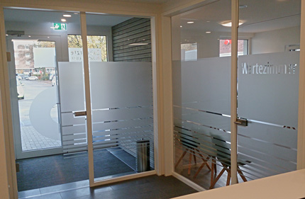 Streifen aus Glasdekorfolien als Sichtschutz, Vorlaufschutz und Info für Wartebereich...
