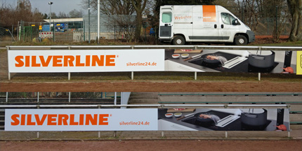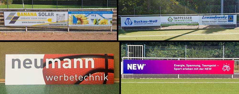 Der dauerhafte und wetterfeste Werbeträger auf Sportplätzen. Wir verwenden ein Alu-Kunststoff-Verbundmaterial (Dibond) in 3 oder 4mm Stärke mit einem hochwertigem, 9c-Digitaldruck. Standardgrößen sind 3000 x 700/750mm. Selbstverständlich mit Montage der Schilder.