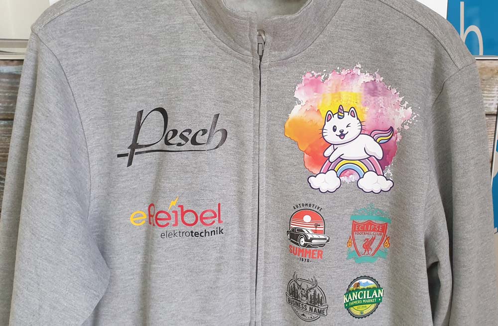 Zum Veredeln Ihrer Textilien verwenden wir hochwertige Techniken. Einfarbige Logos fertigen wir im Folientransfer. Mehrfarbige Logos mit Farb-Transferdrucken. Gerne zeigen wir Ihnen Muster. Preisliste auf Anfrage.