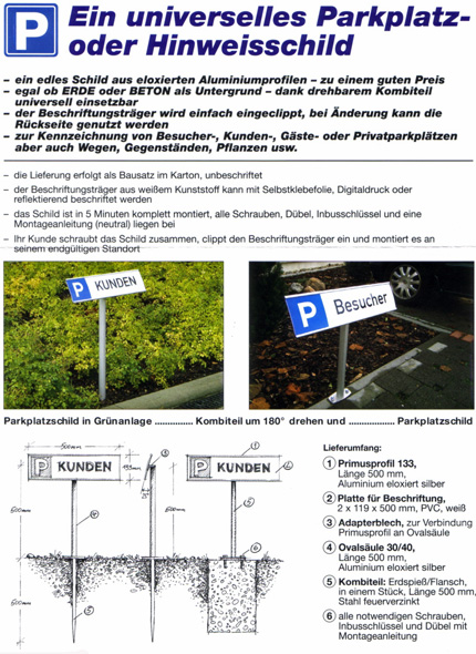 Mit Erdspieß und Platte zum Aufschrauben. Profil zum Einschieben einer Beschriftungstafel.