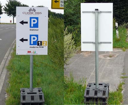 Wir erstellten für die Classic-Days auf Schloss Dyck das Parkplatz-Leitsystem,bestehend aus 41 P-Schildern. Dazu verwendeten wir Verkehrsschildpfosten mit Schellen und je 3 Bodenplatten übereinander für die einfache Aufstellung.