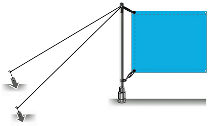 Set-Inhalt: schwarze Transporttasche, 2 Bodendübel, 2 Aluminiumstangen, 4 Erdnägel, 2 Seile, 4 Gummispannfixe. Inkl. 1-seitigem Druck auf Fahnentuch, PVC-Frontlit-Banner oder PVC-Mesh-Banner.