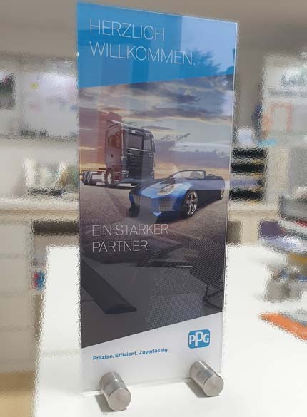 Hier als edler Tischaufsteller mit 2 gegeneinander geklebten Acrylglastafeln und rückseitigem Digitaldruck. Die Kanten des Acrylglases sind Hochglanz-poliert