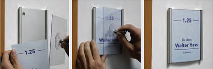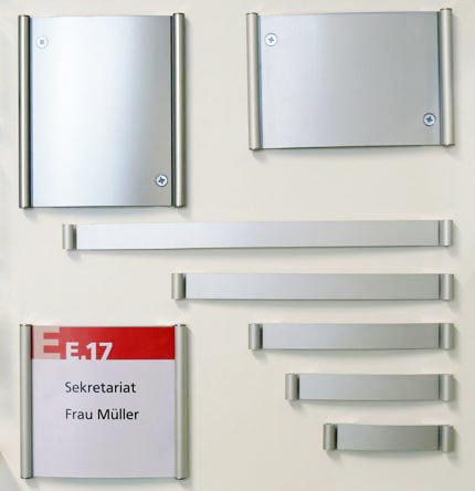Die Abdeckung erfolgt bei diesen Aluminium-Schildern mit einer Kunststoff-Anti-Reflexscheibe, die ein einfaches entnehmen mit einem Montagesauger ermöglicht. Diese Schilder können geklebt oder geschraubt verden. Es stehen 5 versch. Profilbreiten zur Verfügung.