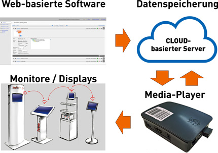 Wir bieten Ihnen Speicher (Cloud), Steuereinheit (Controller), Software, Abspielgerät (Media-Player) und Digitale Wiedergabeflächen (Monitor, Fernseher)