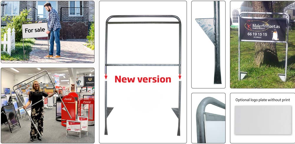 Starker Halter aus 32mm galvanisierten Stahlrohren. Mit Schienen zum Einsetzen von 3mm starken Tafeln. Leicht in die Erde zu stecken (40cm).