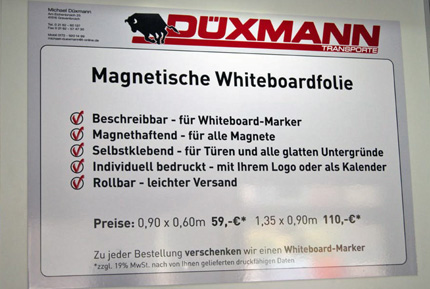 Die Folien sind rollbar, magnetisch und einfach auf allen glatten Untergründen zu vekleben. Es müssen keine schweren Platten mehr mit vielen Bohrungen montiert werden. Die Oberfläche aus Whiteboardfolie ist beschreibbar und wieder entfernbar.