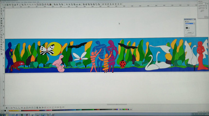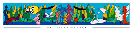 Der Künstler Dieter Patt gab uns einzelne Elemente, die von uns gescannt und mit Ihm am PC als Gesamtkunstwerk zusammengestellt wurden. Anschließend konturierten wir den Entwurf und legten mit Ihm die Farben fest. Dann produzierten wir das Original-Kunstwerk.