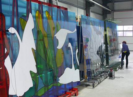 Rückseitig folierte Glas-Tafeln, Gesamt 12,40x2,12m.